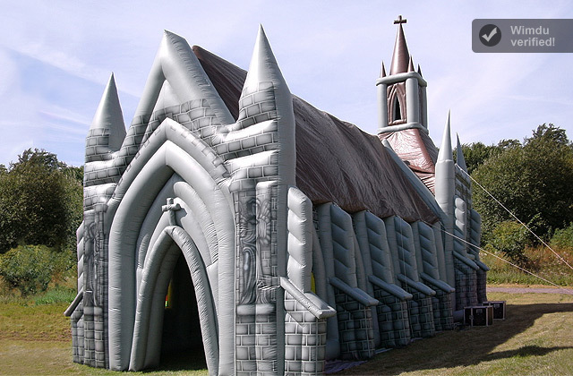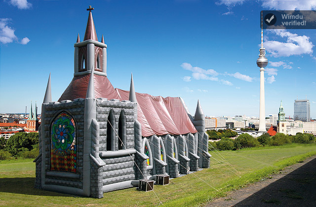 10 mètre de haut, 15 de long, l’église gonflable (difficile de lui donner un style : romane ou gothique ?) sera ouverte de 10 heures à 18 heures. Un certificat de mariage vous sera remis par un représenant officiel de Wimdu et vous aurez même droit à une surprise (me demandez pas, j’sais pas). Attention : la bague et le mari gonflable ne sont pas fournis.