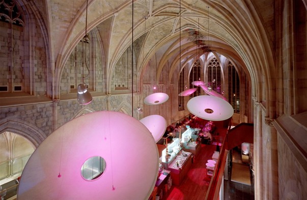 La nef de l’église accueille la réception, trois salons et salles de réunion, une bibliothèque et une mezzanine où les clients prennent leur petit-déjeuner. La déco est totalement contemporaine et assez réussie.