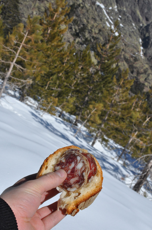 Après 10 min 1h de raquettes, la pause s’impose et vous vous doutez bien qu’avec la charcuterie corse on s’est fait plaisir. C’est même un spuntinu que nous ont offert nos hôtes (vous l’avez deviné parce que vous êtes balaise, c’est “casse-croûte” en corse) :