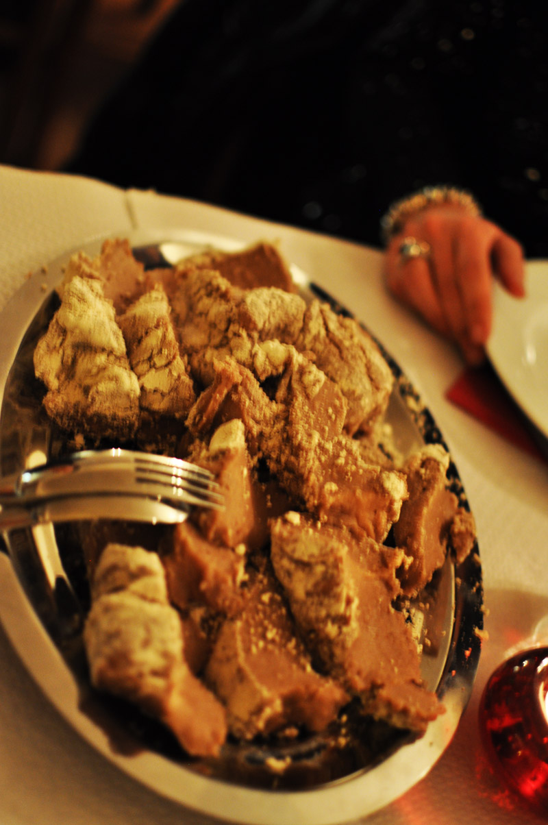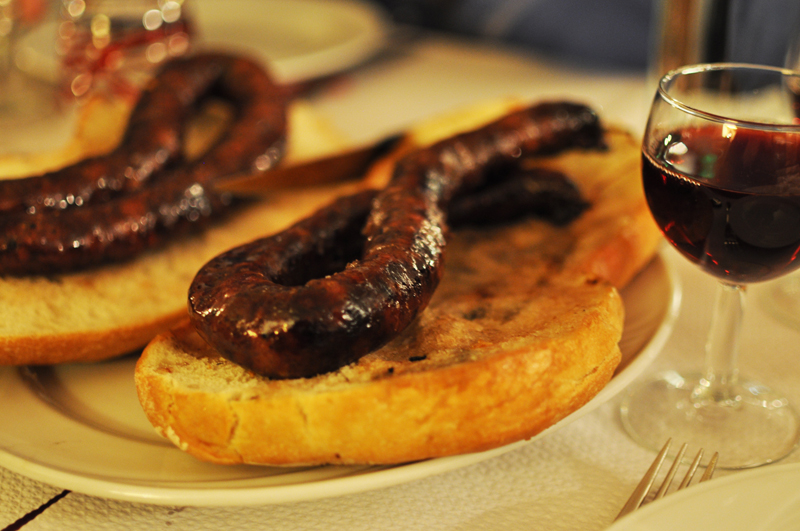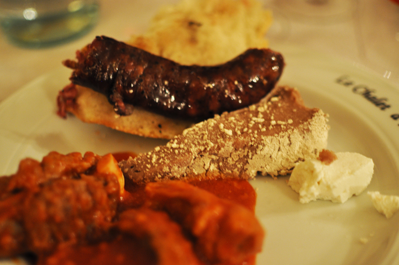 – figatellu (saucisse de porc) au feu de bois, brocciu (fromage frais de brebis), cabri en sauce, petit vin corse, fiadone en dessert (gâteau à base de brocciu)… une vraie soirée corse !!