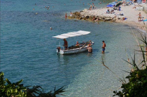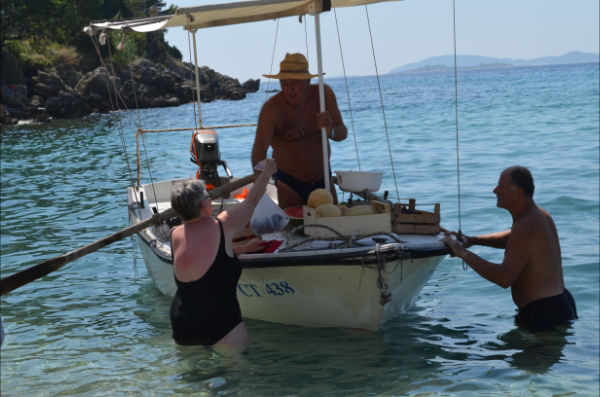 On se demande bien pourquoi cette grosse barque se dirige plein gaz vers la plage bondée, coupe le moteur pour passer au dessus de la corde de limite de bain et continue sa course à la rame. Serait un attentat suicide à la barque piégée ? Au bout de quelques secondes d’observation, on parvient à voir que ce papi (dont le maillot laisse bien voir ce que l’on n’a pas vraiment envie de voir) transporte des caisses de fruits et légumes. Mais dans quel but ? Tout devient beaucoup plus clair quand les gens de la plage commencent à se diriger vers le bateau pour faire leurs emplettes et taper la causette avec le “Croate du coin” qui, c’est bien connu, nous dépanne très souvent. Il semble d’ailleurs que nous soyons les seuls surpris avec notre appareil photo !!