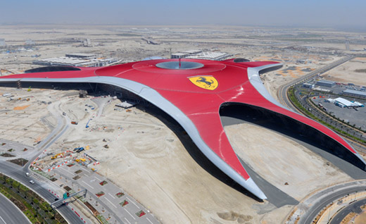 Ferrari est une marque qui fait rêver. Et en ce moment les projets les plus fous sont souvent au moyen orient, du côté par exemple d’Abou Dabi. C’est là-bas que le cheval cabré a lancé en novembre 2010 le plus grand parc d’attraction couvert du monde, de l’univers, de la galaxie : le Ferrari World.