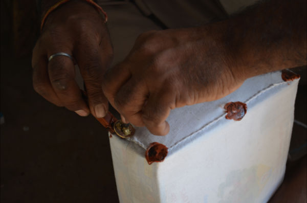 L’homme nous ouvre son magasin dont la devanture est une agence de voyages. A l’intérieur, il nous donne une estimation du prix par colis et nombre de scellés à la cire, les seuls “officiels” du quartier selon lui. Beaucoup trop cher, nous décidons de tenter notre chance ailleurs. Nous nous retrouvons donc chez un tailleur, bien à l’ancienne, qui nous confectionne des housses sur mesure pour mettre nos colis dedans, c’est pas mignon ?