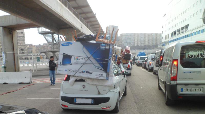 Quand vous attendez pour l’embarquement sur le bateau, vous êtes surpris par les voitures surchargées “qui rentrent au bled”. Des voitures qui amènent en Tunisie beaucoup de matériel (notamment électro-ménager). Surchargées jusqu’à leur faire toucher le sol, vous serez surpris ce que peut emmener une petit Clio. De mémoire de Valentin, la voiture la plus insolite jamais vue à l’embarquement : juste avant d’embarquer, ils ont ficelé une machine à laver sur le capot d’une petite voiture. B L I N D E E la caisse ! Il faut préciser qu’il n’y a pas de limite de poids pour rentrer sur le bateau…