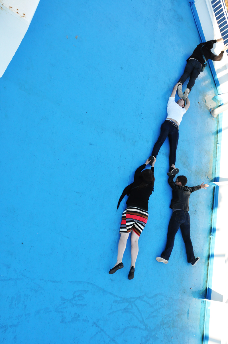 Ca vous pouvez le faire sur n’importe quel bateau, et on s’est bien marré à la faire : se croire sur le Titanic en train de sombrer et s’attacher aux barrières ! Avec une petite photo, et un bon cadrage, vous pourrez dire que vous êtes un miraculé. Rassurez-vous, pas l’ombre d’une avarie sur notre bateau 🙂 Merci Max et Adrien !