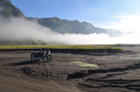 Pour l’admirer sous son meilleur angle, il faut monter sur le mont voisin, le Gunung Penanjakan, à 2770m. Il est recommandé d’y aller pour le lever du soleil. C’est donc dans la joie et la bonne humeur que nous partîmes à 3h30 du matin (donc dans le noir total) en moto sur une “route” glissante et fracassée qui s’oublie dans ce désert de sable. Humm, nous voilà au milieu de nulle part, sans visibilité avec ce brouillard matinal épais, nous ne voyons pas à 5 mètres. Malgré les 4×4 qui nous doublent et nous indiquent que nous allons dans la bonne direction, il est impossible de se repérer et nous n’allons pas assez vite pour les suivre.