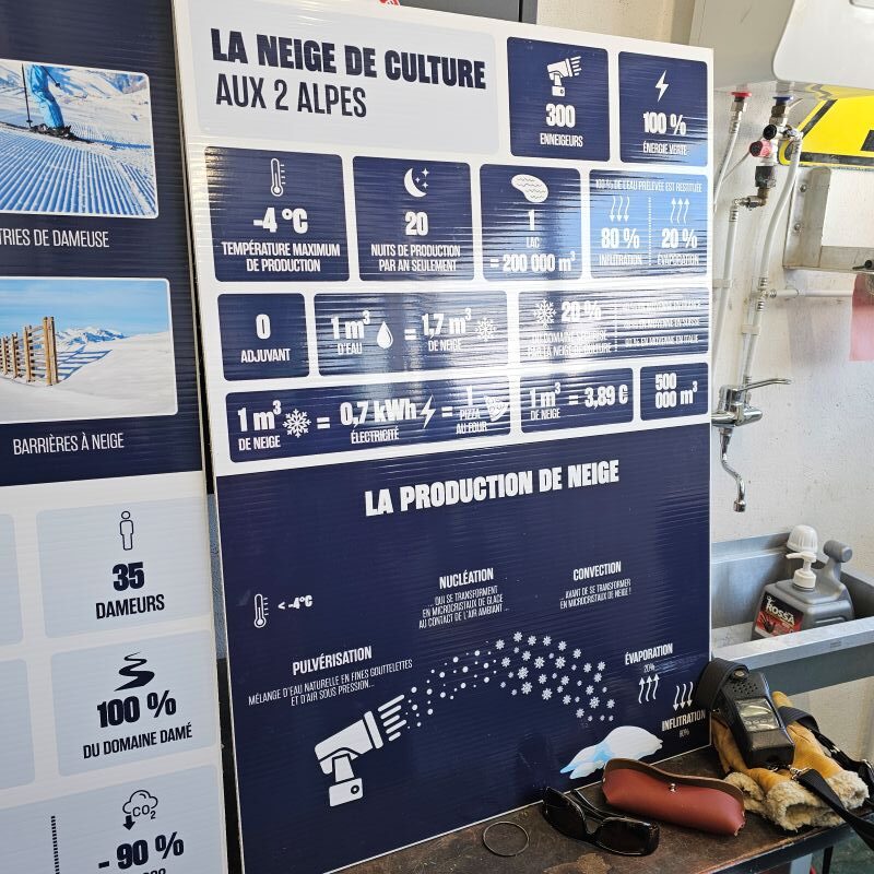 Une usine qui avec de la pression et de l’eau permet la culture de la neige à travers 300 enneigeurs discéminés sur le domaine.