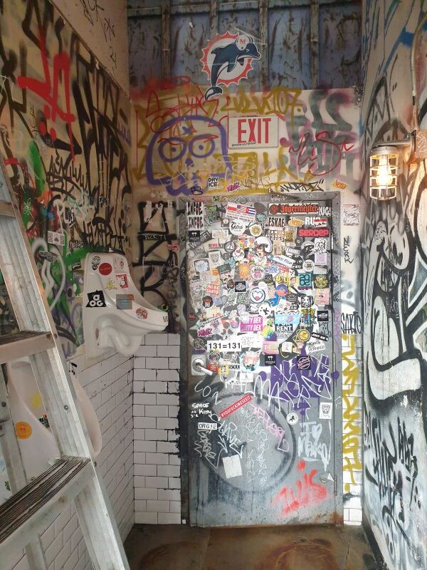 Et c’est tout à fait par hasard, par curiosité, que je décide de pousser cette porte au fon des toilettes. Une porte qui semblait presque condamnée, couverte de tags et d’autocollants…